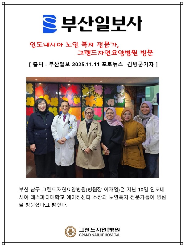[부산일보] 인도네시아 노인 복지 전문가, 그랜드자연요양병원 방문 페이지 정보 작성자 최고관리자 작성일25-11-17 11:55 조회615회 댓글0건 다음글 목록 본문 [ 출처 : 부산일보 2025. 11.11 포토뉴스 김병군 기자 ] 댓글목록 등록된 댓글이 없습니다. 다음글 목록