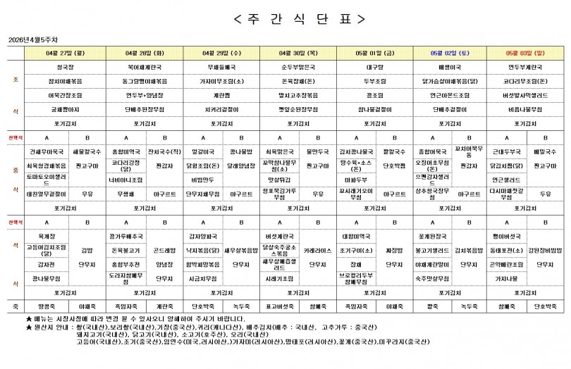 주간 식단표 (4월 5주) 페이지 정보 작성자 최고관리자 작성일26-04-24 09:47 조회8회 댓글0건 다음글 목록 본문 주간 식단표 (4월 5주) 댓글목록 등록된 댓글이 없습니다. 다음글 목록