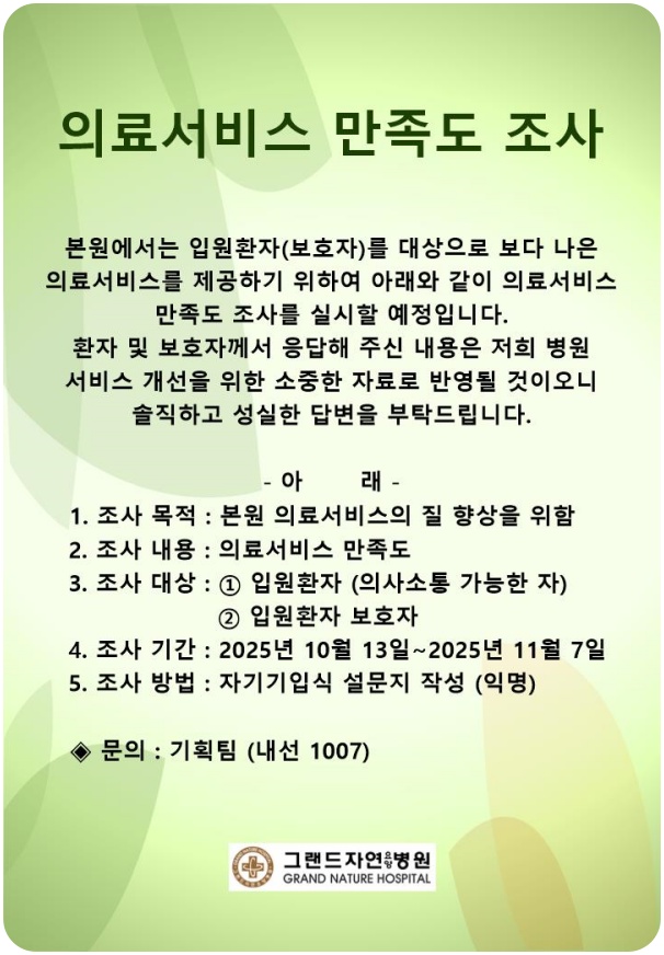 의료서비스 만족도 조사(2025년10월13일~11월7일) 페이지 정보 작성자 최고관리자 작성일25-10-10 12:24 조회25회 댓글0건 이전글 다음글 목록 본문 의료서비스 만족도 조사 댓글목록 등록된 댓글이 없습니다. 이전글 다음글 목록