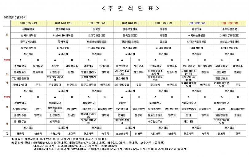 주간 식단표 (10월 3주) 페이지 정보 작성자 최고관리자 작성일25-10-10 15:12 조회48회 댓글0건 다음글 목록 본문 주간 식단표 (10월 3주) 댓글목록 등록된 댓글이 없습니다. 다음글 목록